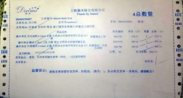но только не перечеркнуто и с печатью, а скорей двумя. Этот чек из ювелирного магазина Daimi — как видим, солидная фирма, солидный чек. Обратим внимание валюта — 元 (юань), сумма, дата продажи, подпись продавца — есть все.