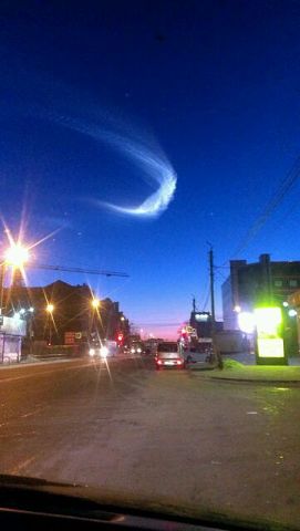 Около 6.30 в небе над городом появился светящийся объект, который оставил за собой след, напоминающий, по выражению одного из очевидцев, «лунный водопад».