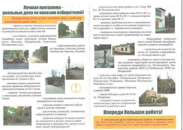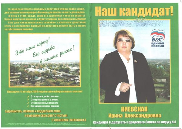 Неравнодушные свободненцы принесли нам предвыборную программу кандидата в депутаты городского Совета И.А. Киевской, отпечатанную в Свободненской типографии. Посмотрим, что сделано из обещанного.